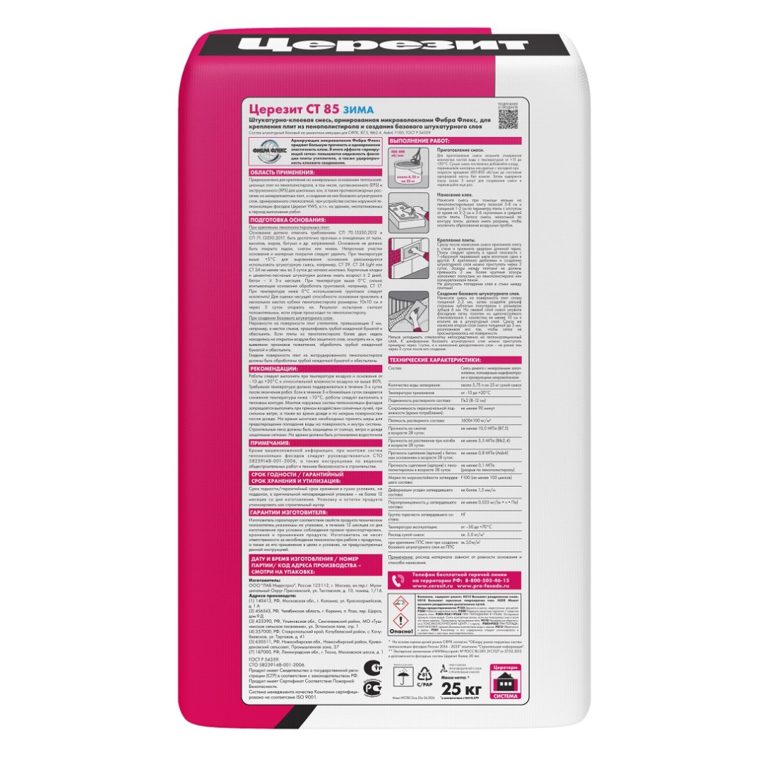Описание товара: "Штукатурно-клеевая смесь Ceresit СТ 85 для пенополистирола Зима (25 кг)"