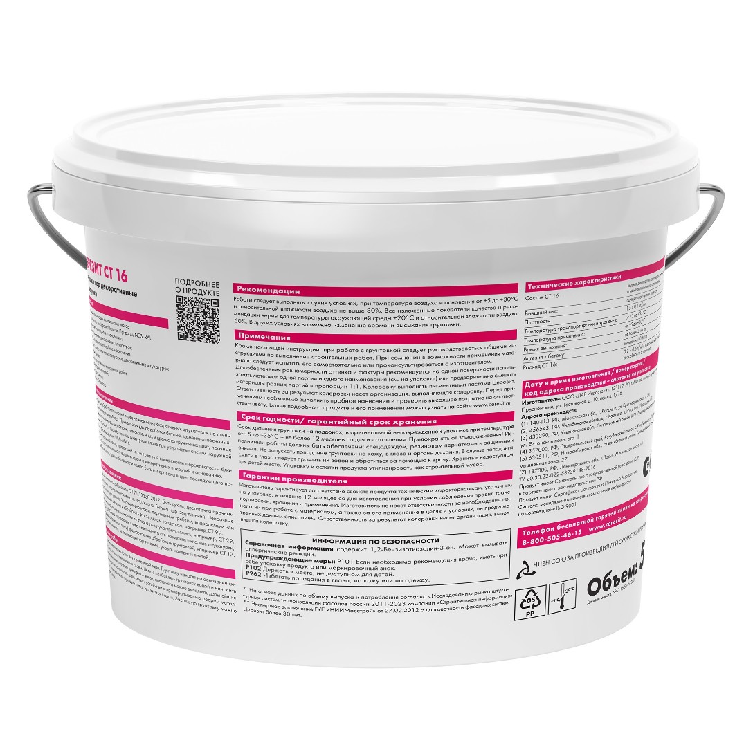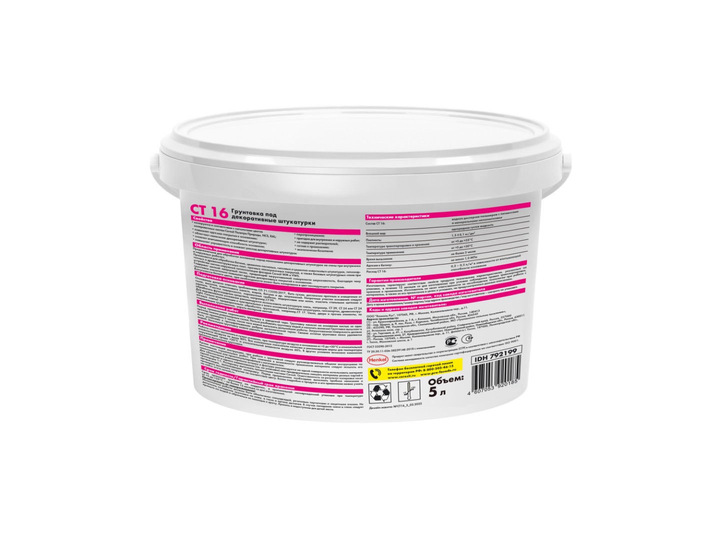 Назначение грунтующего состава CT 16 — подготовка поверхностей к нанесению декоративных штукатурок. Используется как во внутренних помещениях, так и при обработке фасадов. Грунтовка подходит практически для всех видов оснований: от гипсокартона и бетона до древесностружечных панелей и цементно-песчаных штукатурных смесей. Она обеспечивает отличный результат на прочных лакокрасочных покрытиях, гипсовых поверхностях и цементно-известковых основаниях. Также применяется в качестве базовой защиты фасадов в наружных теплоизоляционных системах Ceresit VWS и WM.