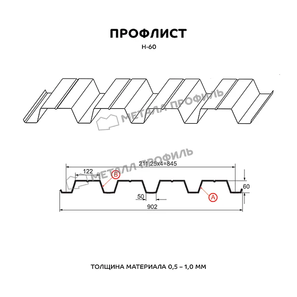Профлист МЕТАЛЛ ПРОФИЛЬ Н-60x845-A (ПЭ-01-1014-0,7) широко применяется для оформления профилированного листа. Изначально он представляет собой лист оцинкованной стали с покрытием. Общая толщина металла с цинковым и полимерным слоем составляет 0.7 мм. Проходя процедуру холодного проката, сталь приобретает рисунок из ритмичных волн. Несущая способность такого листа на порядок выше плоского.